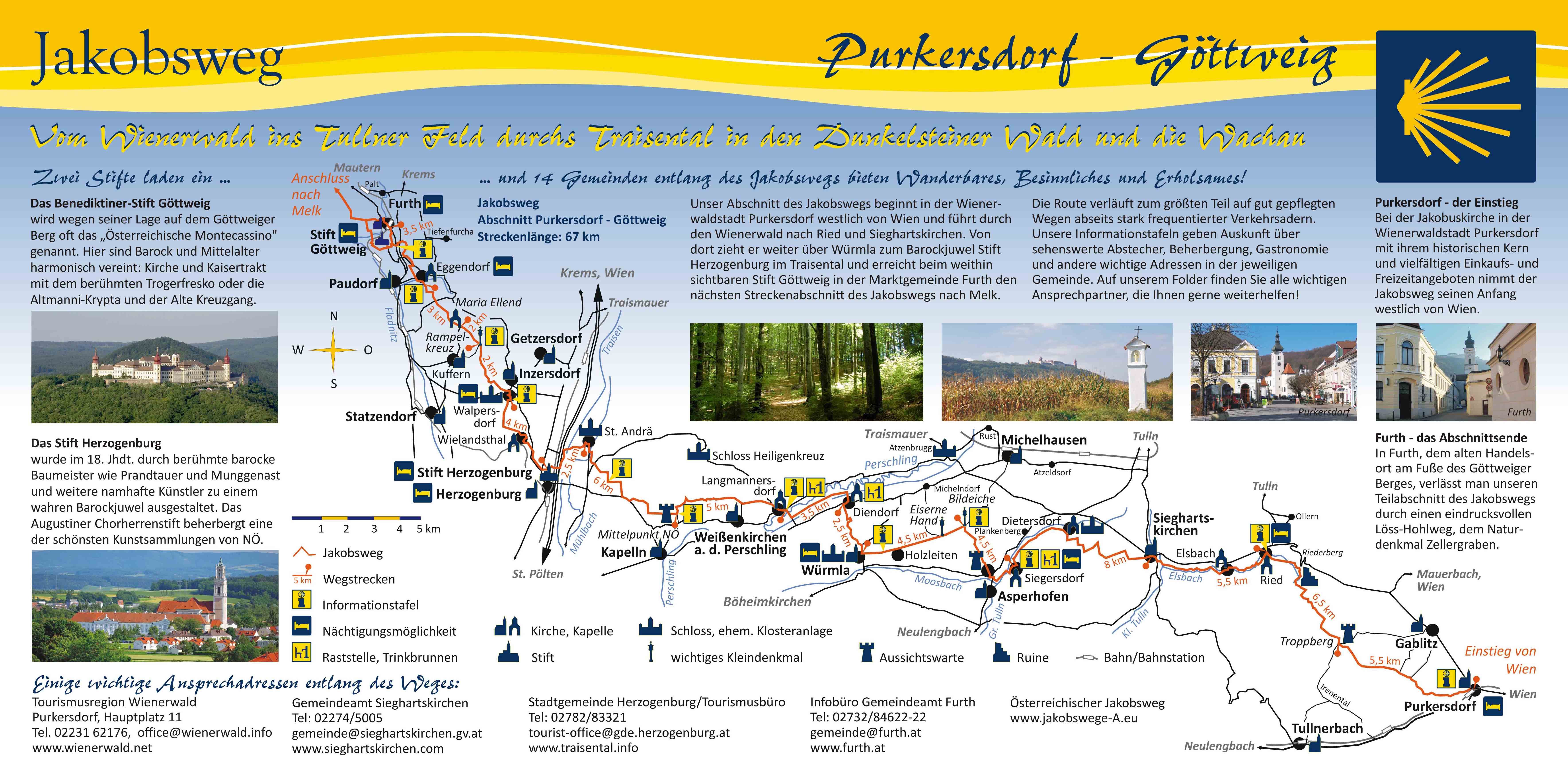 Info: Das Teilstück ist mit einem Informations- und Leitsystem ausgestattet. Mehr als 200 Wegweiser und elf Informationstafeln leiten die Pilgerfreunde an. Sie geben Hinweise zur jeweiligen Gemeinde und liefern wichtige Adressen zu Beherbergung und Gastronomie, Arzt und Apotheken, sowie Pfarren und Gottesdienste.